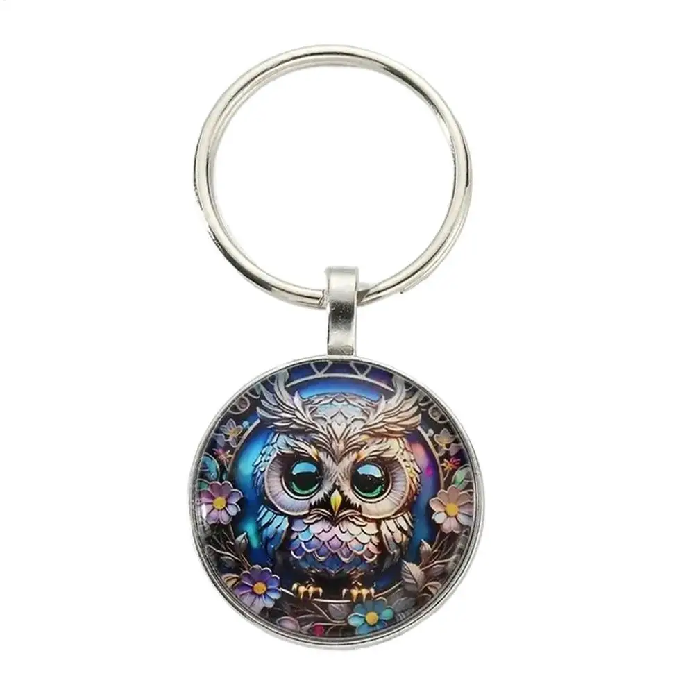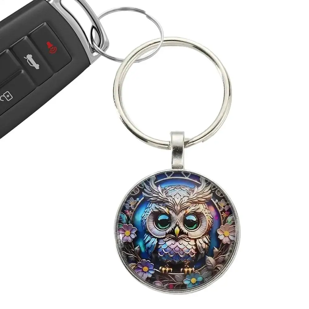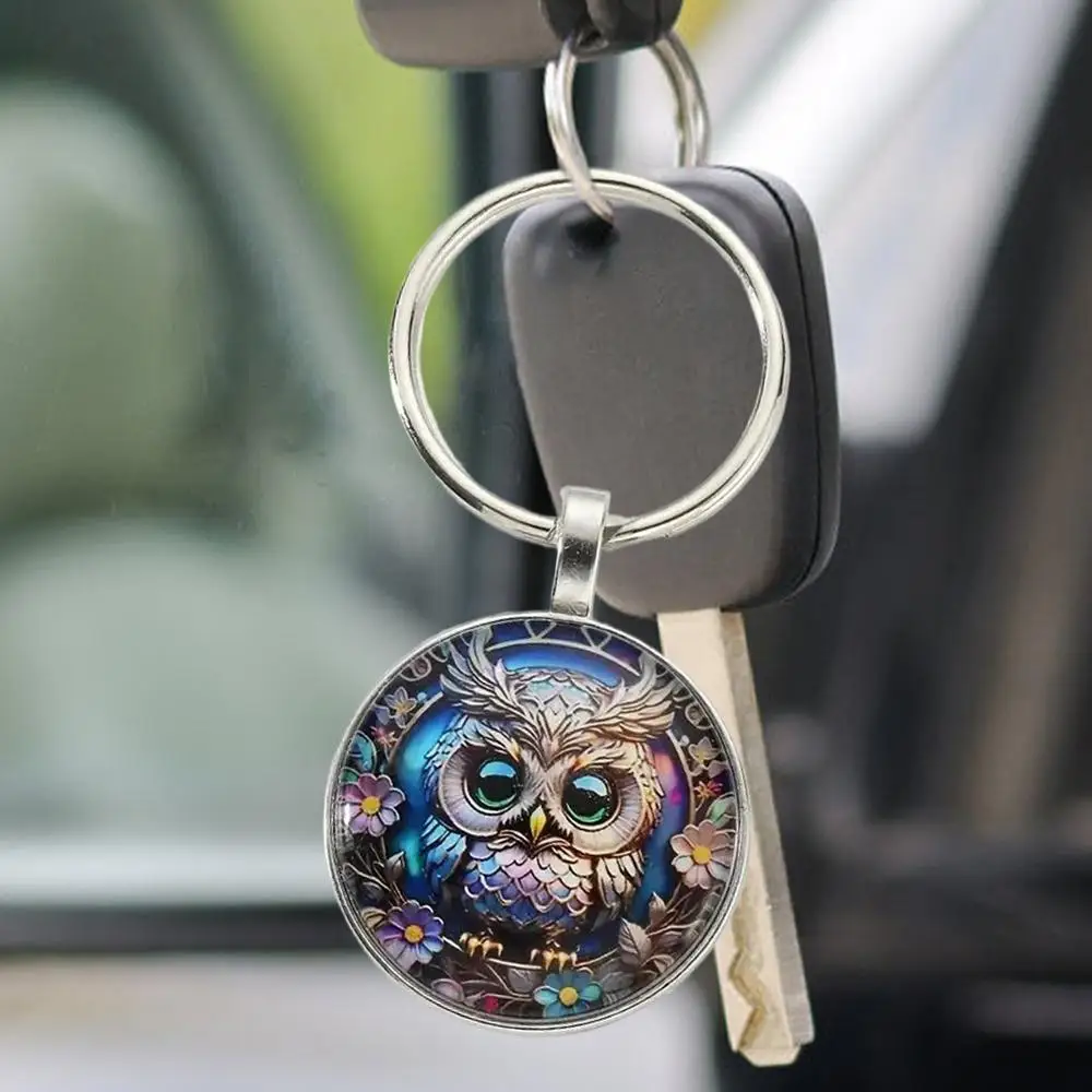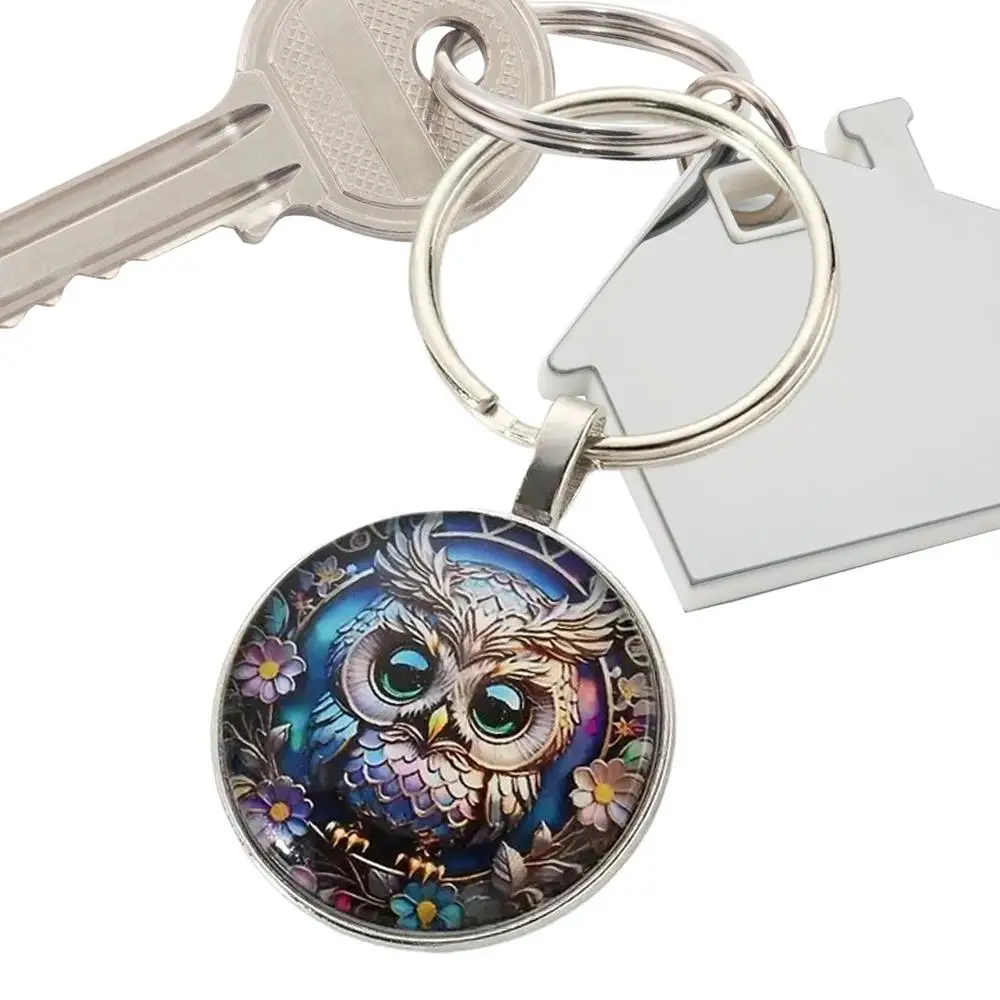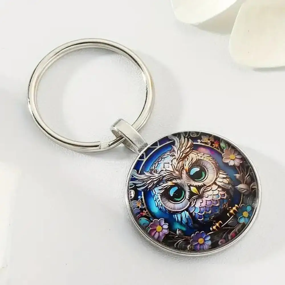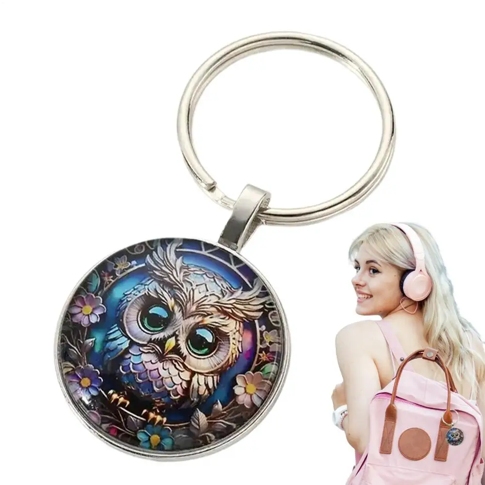 1PC Owl Pattern Circular Glass Keychain Pendant Accessory Metal Keyring Pendant Small Gift Portable Decorative Key Purse Charm