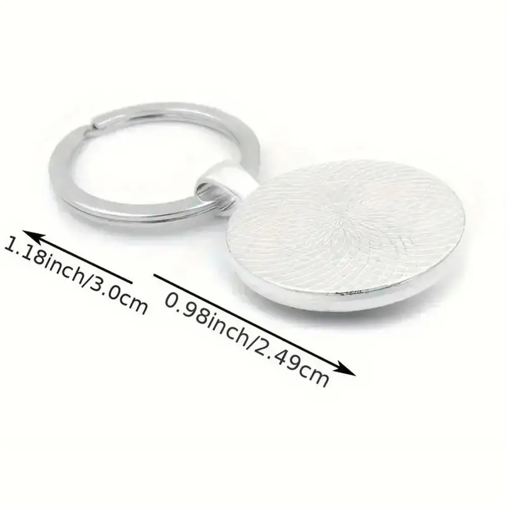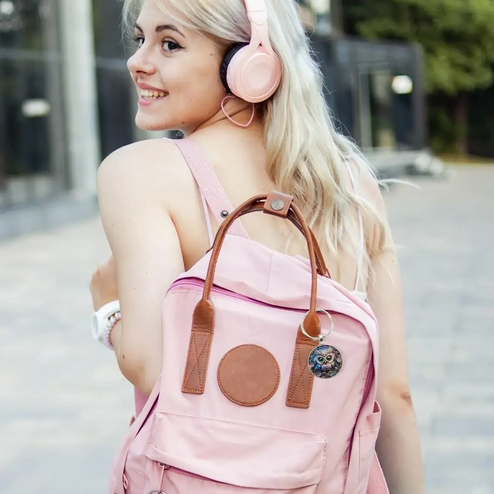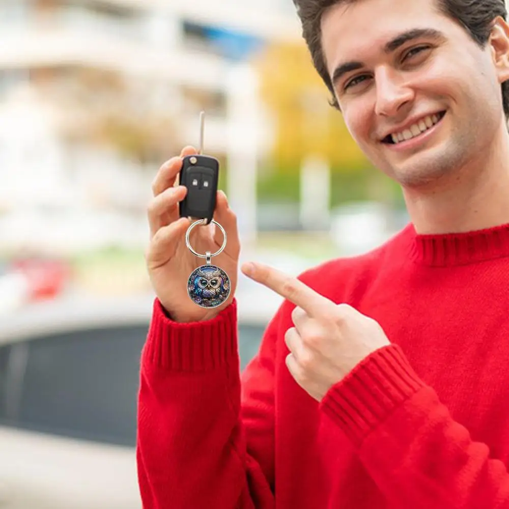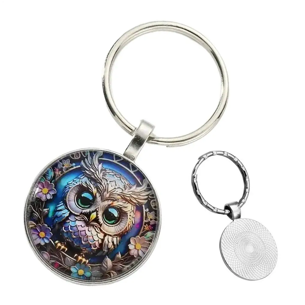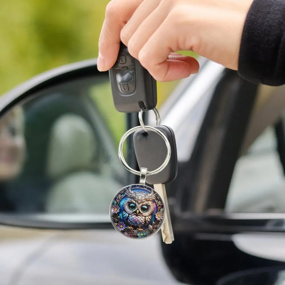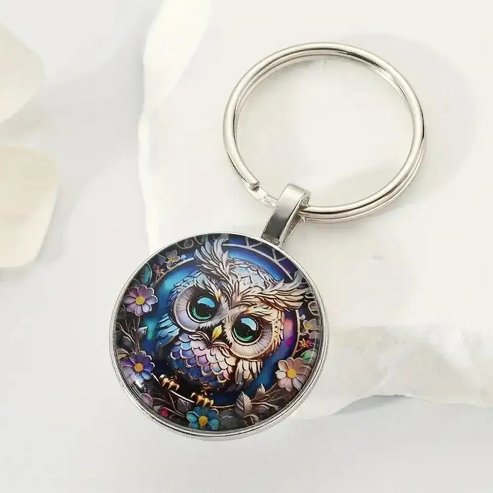 1PC Owl Pattern Circular Glass Keychain Pendant Accessory Metal Keyring Pendant Small Gift Portable Decorative Key Purse Charm